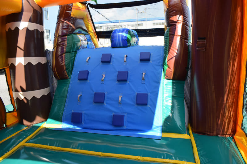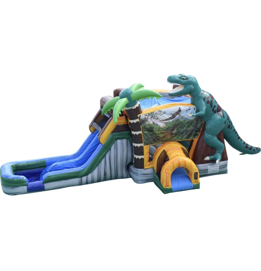Don't miss one of Inflatafuns newest additions The Dino world water slide bounce house Combo! There is nothing quite like this unit, the outside features a 3D giant TRex dinosaur, 3D palm tree, jungle theme painted art panel and two water slides with a large splash pad landing. The inside features a basket ball hoop bright colors for all. Watch your little one smile from ear to ear as they watch TRex the inflatable Dino come to life in 3D! We deliver the fun for all ages and occasions. This Dinosaur water slide bounce house combo can be delivered to Carlsbad NM, Loving NM, Malaga NM. Book online with us today!