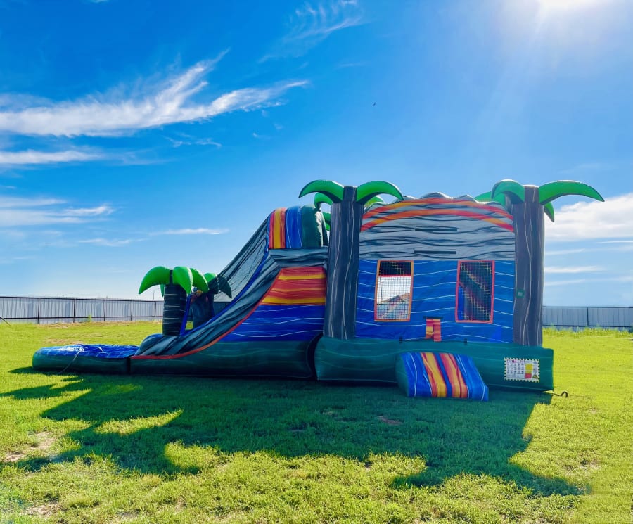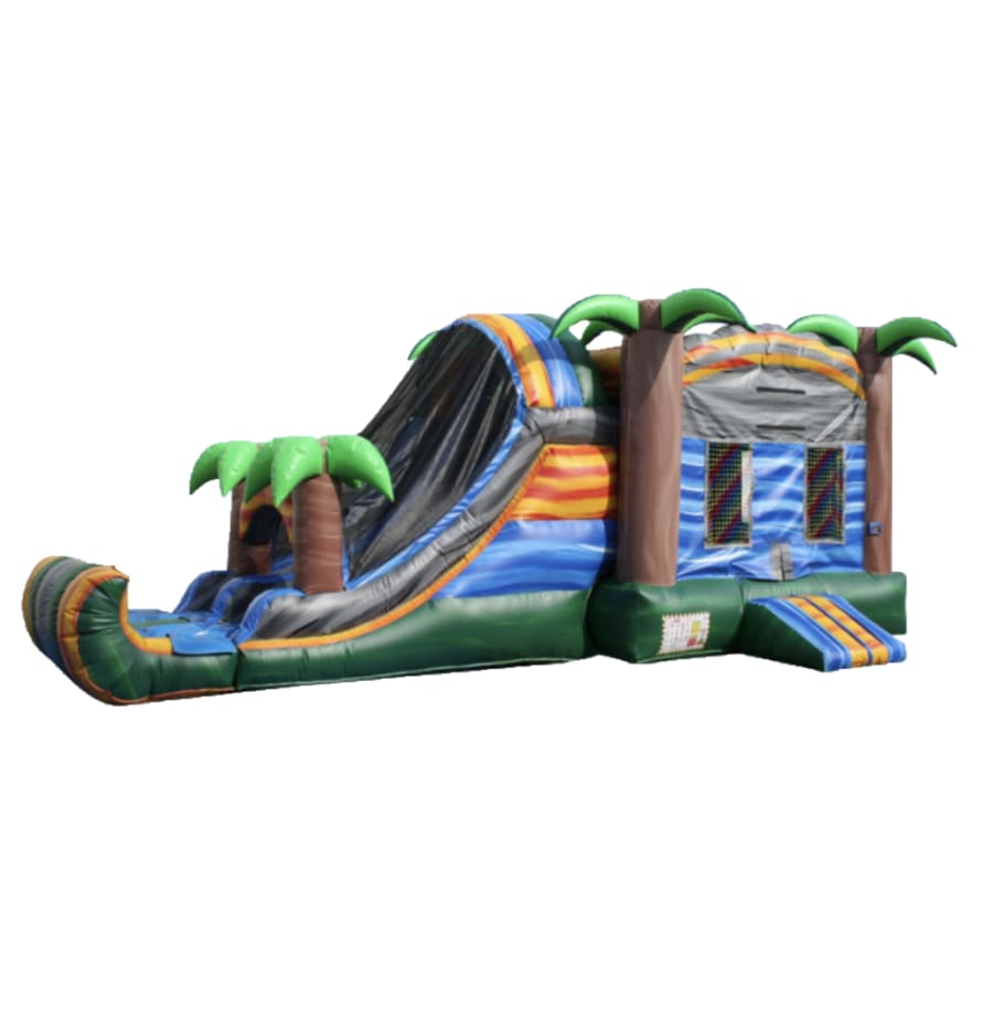 Welcome to Inflatafuns Tropical Rainforest water slide bounce house Combo! This unisex unit features 3D palm trees, dual lane water slides with a large splash pad landing. The inside features a basket ball hoop and bright colors for all. We deliver the fun for all ages and occasions. This one of a kind tropical water slide/ bounce house can be delivered to Carlsbad NM, Loving NM, Malaga NM. Book online with us today!