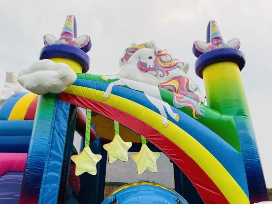 Don't miss one of Inflatafuns newest additions The unicorn water slide bounce house Combo! This unicorn bounce house is sure to make your little ones day! It features bright colors, 3D popouts, large unicorn in front and on top of the slide, and twinkle lights to add that special touch and make your day as magical as it should be. This unicorn bounce house also has an attached water slide that can be used dry durning the colder times. We deliver the fun for all ages and occasions. This unicorn bounce house water slide inflatable combo can be delivered to Carlsbad NM, Loving NM, Malaga NM. Book online with us today!