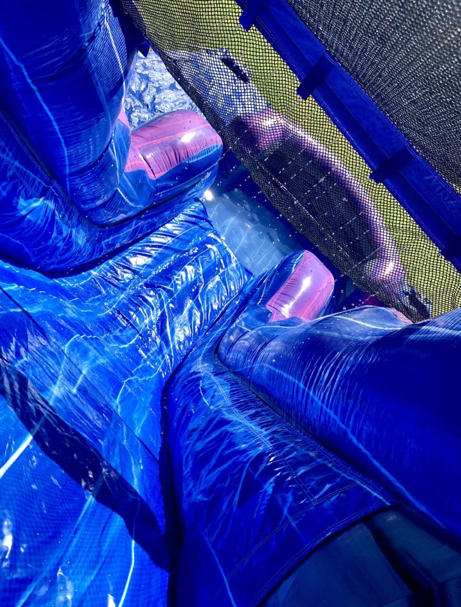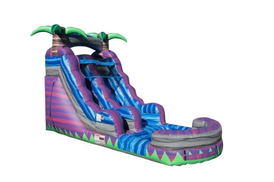 Feel the rush with our Purple Rush waterslide! This 15 ft tall water slide is perfect for parties, gathering or just because you want to have some fun! It features beautiful and vibrant blue and purple marbled colors and two palm trees at the top with a wide slide and large landing pool. From your oldest to youngest everyone is sure to have a blast on this fun waterslide! Inflatafun delivers the fun for all ages and occasions. This waterslide can be delivered to Carlsbad NM, Loving NM, Malaga NM. Book online with us today!